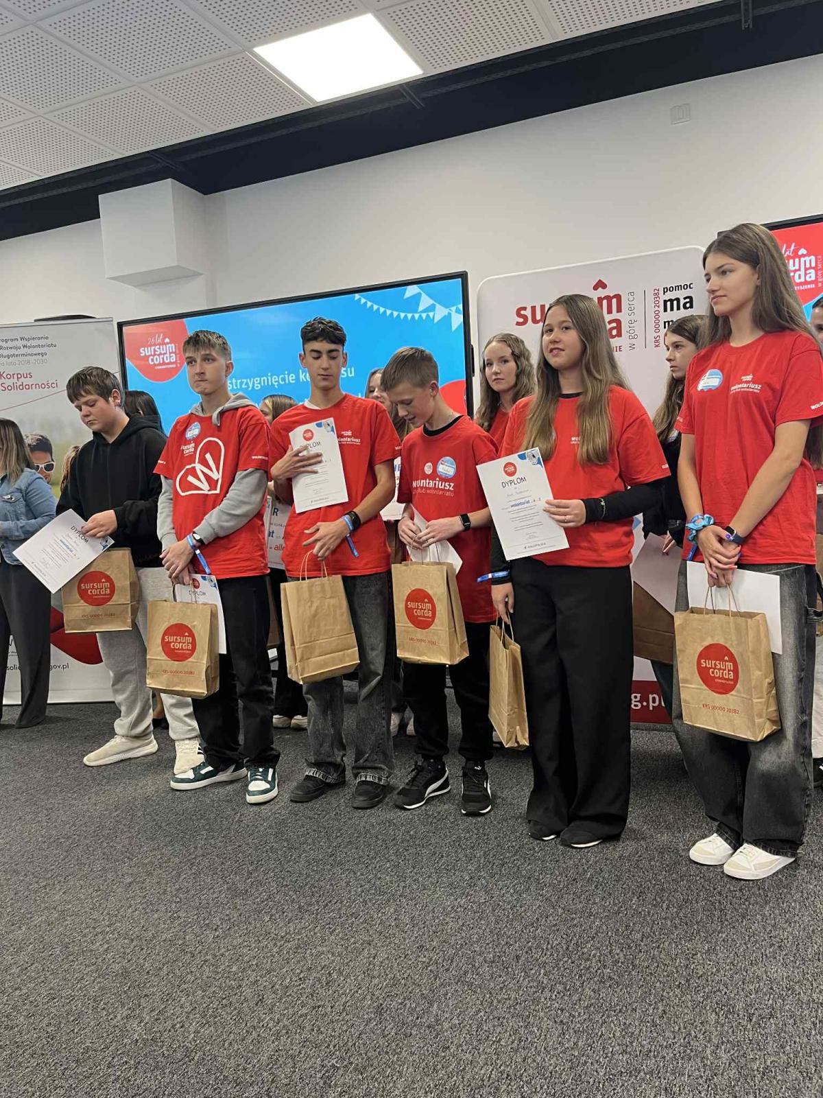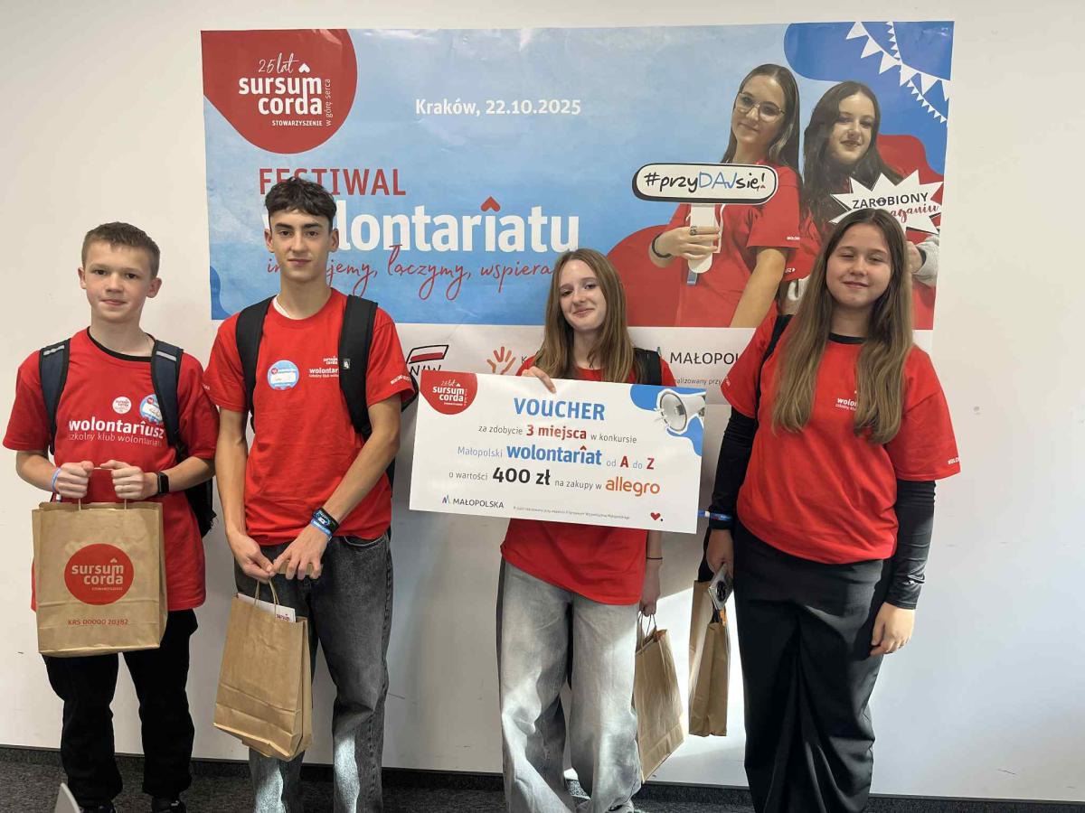 22 października, nasi wolontariusze wzięli udział w Festiwalu Wolontariatu organizowanym przez Stowarzyszenie Sursum Corda w Krakowie. Wydarzenie odbyło się w inspirującej i pełnej pozytywnej energii atmosferze, gromadząc młodzież i opiekunów z różnych części Małopolski. Jednym z najbardziej poruszających punktów programu było spotkanie z Szerpami Nadziei – grupą pasjonatów, którzy nie tylko zdobywają szczyty, ale również pomagają osobom z niepełnosprawnościami spełniać marzenia o górskich wyprawach. Ich opowieści o determinacji, współpracy i niesieniu pomocy były dla wszystkich uczestników ogromną dawką motywacji i wzruszeń. W ramach festiwalu wolontariusze wzięli udział w wartościowych warsztatach "Mapa stylów uczenia się", podczas których mogli odkryć swoje indywidualne preferencje edukacyjne, nauczyć się skuteczniejszych metod nauki oraz zrozumieć, jak różne style wpływają na codzienne funkcjonowanie – zarówno w szkole, jak i w działaniach wolontariackich. Szczególnym momentem wydarzenia był drugi etap konkursu "Małopolski wolontariat od A do Z", w którym nasza reprezentantka, Gosia Butrymowicz, zdobyła 3. miejsce! W nagrodę otrzymała bon na zakupy w serwisie Allegro o wartości 400 zł. Serdecznie gratulujemy Gosi i jesteśmy dumni z jej osiągnięcia! Pozostali nasi uczestnicy również zostali docenieni – wszyscy otrzymali nagrody rzeczowe, które były miłym podsumowaniem ich zaangażowania i obecności na festiwalu. Udział w wydarzeniu był dla nas nie tylko okazją do zdobycia wiedzy i doświadczeń, ale przede wszystkim do integracji, wymiany inspiracji oraz wzmocnienia motywacji do dalszej działalności wolontariackiej. Dziękujemy organizatorom za zaproszenie oraz wszystkim, którzy przyczynili się do stworzenia tego wyjątkowego dnia.
