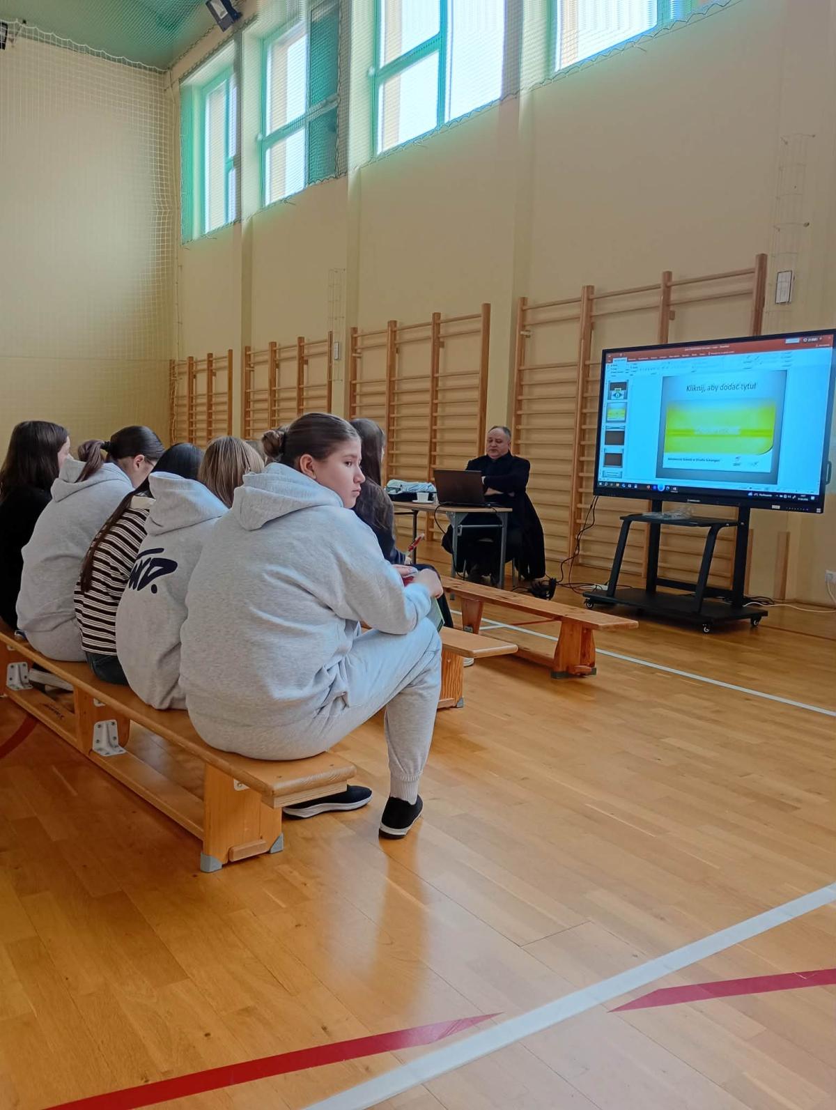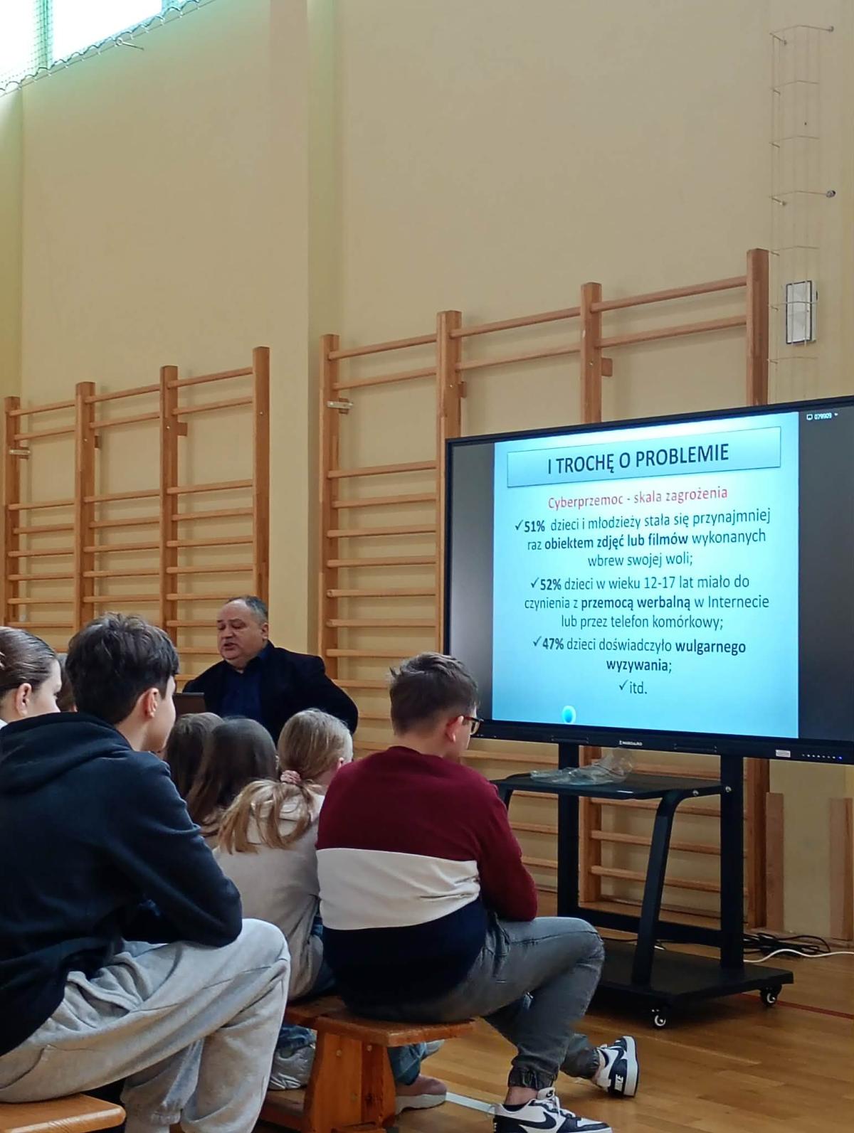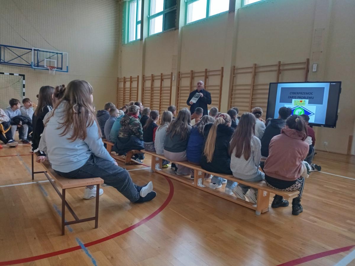 Podczas spotkania uczniowie poszerzyli swoją wiedzę na temat zagrożeń związanych z korzystaniem z internetu, ze szczególnym uwzględnieniem zjawiska cyberprzemocy. Prowadzący omówił jej najczęstsze formy, konsekwencje prawne i emocjonalne, a także wskazał, jak właściwie reagować w sytuacjach zagrożenia. Zwrócił również uwagę na zasady bezpiecznego i odpowiedzialnego korzystania z sieci oraz na znaczenie kultury i szacunku w komunikacji online.